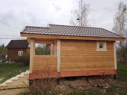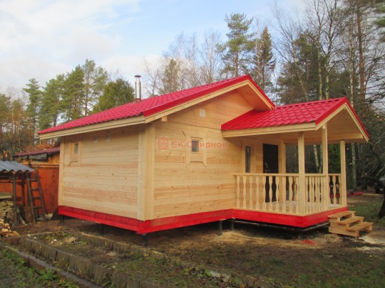 Такая одноэтажная баня 6х6 может быть построена из бруса. Ориентировочный срок строительства 15 дней.