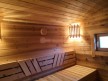 Кедровая вагонка в парной, спинки над пологами и декоративная решётка между пологами. Дверь крашеный усиленный стеклопакет (снаружи RAL 8017, изнутри «Жёлтый»);