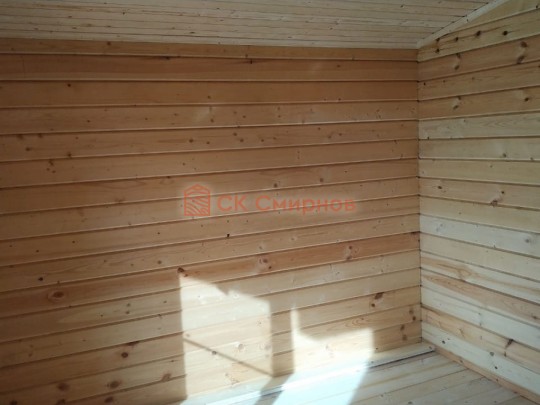 Из профилированного сухого бруса 9х14см, 14х14 см или 14х19 см. Сборка сруба в теплый угол на нагеля или гвозди 200 мм со сверлением отверстия в верхнем брусе (в зависимости от вида бруса).