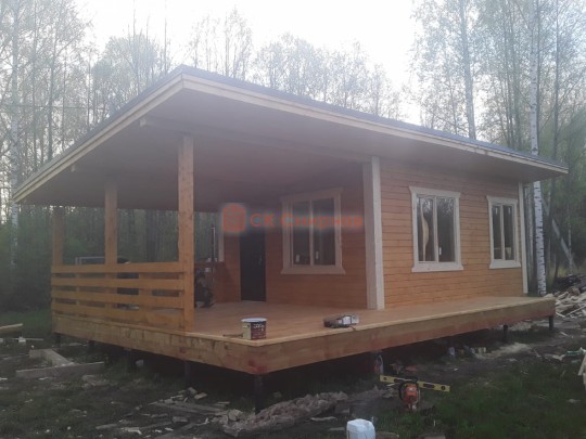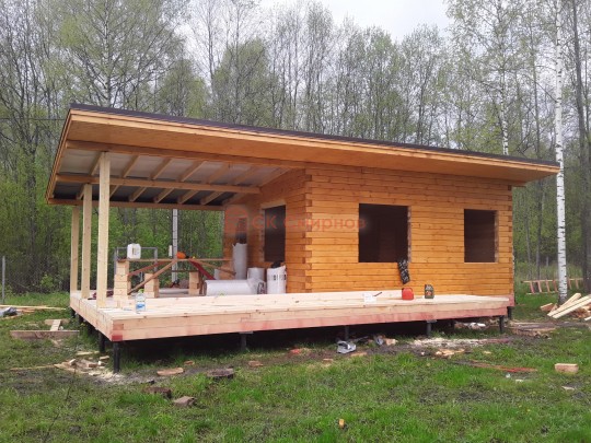 Из профилированного клееного бруса 9х14см, 14х14 см или 14х19 см. Сборка сруба в теплый угол на нагеля или гвозди 200 мм со сверлением отверстия в верхнем брусе (в зависимости от вида бруса).