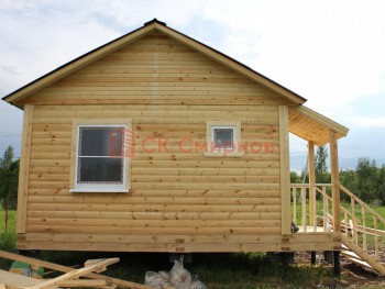Из профилированного сухого бруса 9х14см, 14х14 см или 14х19 см. Сборка сруба в теплый угол на нагеля или гвозди 200 мм со сверлением отверстия в верхнем брусе (в зависимости от вида бруса).