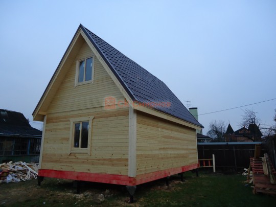 Из профилированного сухого бруса 9х14см, 14х14 см или 14х19 см. Сборка сруба в теплый угол на нагеля или гвозди 200 мм со сверлением отверстия в верхнем брусе (в зависимости от вида бруса).